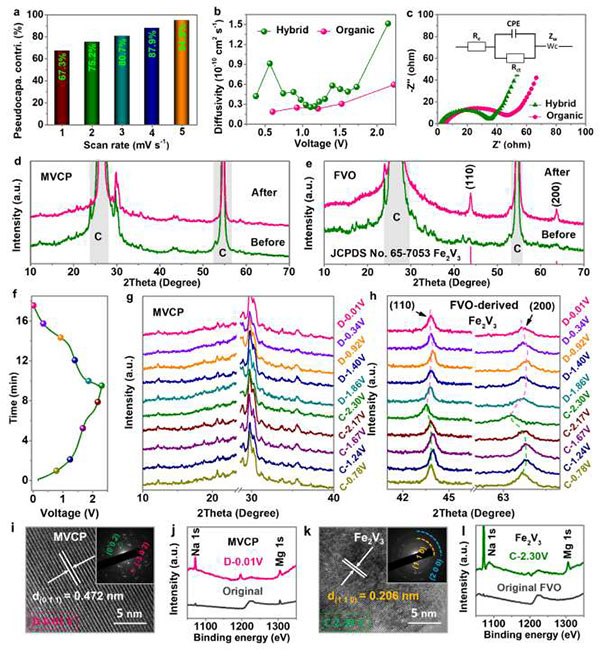(d-e)循环前后全电池中MVCP和FVO的XRD图谱;