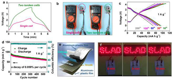 (d)两个电池串联在1 A g-1时的长循环性能;