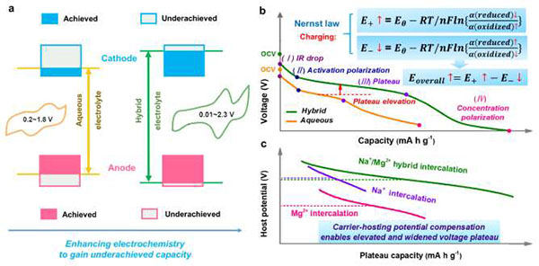 (a)传统水系电解液中电极材料容量未能充分发挥的原因,以及强化电化学过程以实现潜在容量的策略;