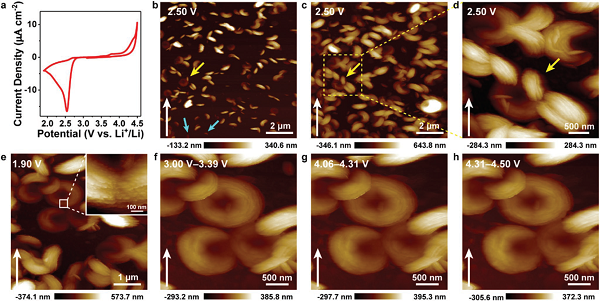 了解水对锂氧反应界面过程的显著影响,对锂氧电池的实际应用具有重要意义。然而,在纳米尺度上阐明水调节活性产物的生长路径和表面动力学仍处于初级阶段。近日,中科院化学研究所万立骏院士和文锐研究员利用原位原子力显微镜成功地揭示了锂氧电池中水介导阴极过程的界面演化过程。在添加剂水的调节下,随着水含量的增加,放电产物Li2O2的形貌由环状变为层状,后者在充电时表现出较低的分解电位和较快的动力学。此外,实时可视化显示,在DMSO基电解液中引入水可以使Li2O2的成核途径由表面介导转变为溶液介导,进而影响产物分布和电池性能。此外,作者还发现外加电流密度和外加水对界面行为有拮抗作用。水对Li2O2成核模式和演化过程的影响进行了深入研究,为进一步了解Li-O2电池的界面反应提供了新的思路。该研究成果以“In Situ Realization of Water-Mediated Interfacial Processes at Nanoscale in Aprotic Li–O2 Batteries”为题发表在著名期刊Adv. Energy Mater上。DOI: 10.1002/aenm.202002339。