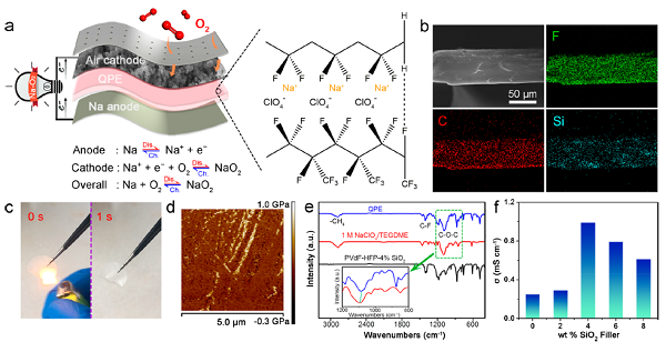 可充电Na−O2电池因其高能量密度、超低过电位和丰富的资源而被认为是最有前途的储能设备。不幸的是,使用液态电解液的传统Na−O2电池经常会出现严重的枝晶生长、电解液泄漏和向Na金属阳极潜在的H2O污染。在此,南开大学陈军院士报道了一种由聚偏氟乙烯-六氟丙烯共聚物-4%SiO2-NaClO4-四乙二醇二甲醚组成的高性能可再充Na-O2电池的准固态聚合物电解质(QPE)。通过密度泛函理论计算表明,QPE的氟碳链有利于Na+的转移,从而获得1.0 mS cm−1的高离子电导率。有限元模拟结果表明,QPE独特的纳米孔结构和较高的介电常数可以在充放电过程中诱导电场均匀分布,从而实现无枝晶的均匀沉积。此外,QPE的非穿透纳米孔结构和氟碳链形成的疏水行为可以有效地保护Na阳极免受H2O的侵蚀。因此,所制备的准固态Na−O2电池在放电容量为1000 mAh g−1时,平均库仑效率高达97%,并且在80圈循环中电压衰减可以忽略不计。作为概念证明,组装了软包Na−O2电池,在从0°弯曲至360°后,其电化学性能稳定达∼400 h。这项工作展示了准固态电解质在高性能柔性钠氧电池中的潜在应用。该成果以“Room-Temperature Flexible Quasi-Solid-State Rechargeable Na−O2 Batteries”为题,发表在ACS Cent. Sci上。DOI: 10.1021/acscentsci.0c00849。