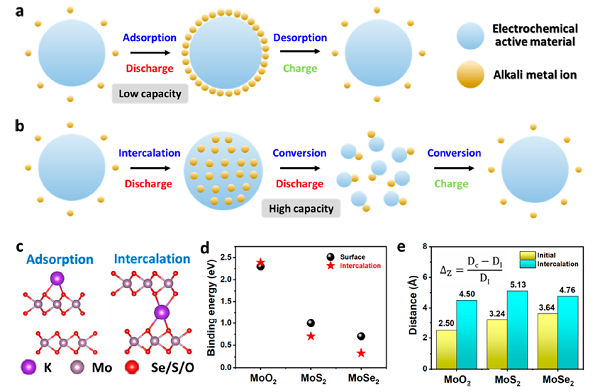 钾离子电池由于钾的天然丰度和钾离子氧化还原电位较低,显示出作为下一代电化学储能系统的巨大潜力。为了适应K离子的大离子半径,转换型电极材料被认为是适合存储K离子的材料。然而,大多数PIBs阳极材料的转换反应触发机制尚不清楚,这限制了它们的进一步发展。为了揭示其机理,清华-伯克利深圳学院成会明院士和周光敏副教授选择了MoSe2、MoS2和MoO2作为模型材料,在理论计算的指导下,研究了K离子的存储过程。通过原位表征发现,在MoSe2和MoS2中优先发生插层反应,在MoO2中优先发生吸附反应。这是因为MoSe2和MoS2的层间间距比MoO2大,K离子插层屏障更低。优先插层反应可以通过降低反应屏障诱导进一步的转换反应,从而实现高的K离子存储能力。因此,MoSe2-rGO和MoS2-rGO杂化比MoO2-rGO杂化表现出更高的可逆能力。作者通过阐明插层与转换反应之间的关系,了解其机理,为选择电极材料获得高性能的PIBs提供指导。该研究成果以“Intercalation-Induced Conversion Reactions Give High-Capacity Potassium Storage”为题,发表在ACS Nano上。DOI: 10.1021/acsnano.0c06606。