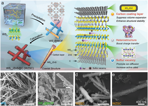 工程化新型电极材料具有独特的结构,对于调节二次电池系统的结构/电化学性能具有重要影响。近日,北京理工大学吴锋院士、吴川教授与武汉理工大学麦立强教授合作从组织良好的WS2纳米棒出发,提出了一种新颖的一步法制备具有同轴碳涂层的双金属硫化物复合材料的方法,通过简单地ZIF-8的引入实现。可以同时形成富硫空位和WS2/ZnS的异质结构,显著改善离子和电子扩散动力学。此外,复合材料表面周围的均匀碳保护层保证了出色的结构稳定性,在5000次循环后,以5 A g−1的倍率可逆容量为170.8 mAh g−1。基于在实际应用中具有很大潜力的WS2−x/ZnS@C阳极和P2-Na2/3Ni1/3Mn1/3O2阴极组装的全电池可以保持在1 A g−1下500次循环后,可逆容量为89.4 mAh g−1。此外,通过理论计算、电化学动力学分析和操作X射线衍射表征,详细阐述了其电化学储钠机理。该成果以“Co-Construction of Sulfur Vacancies and Heterojunctions in Tungsten Disulfide to Induce Fast Electronic/Ionic Diffusion Kinetics for Sodium-Ion Batteries”为题,发表在Adv. Mater上。DOI:10.1002/adma.202005802。
