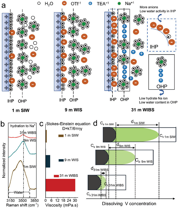 由于水分子极性强,质量溶解是水电解质中阴极的主要问题之一。从原理上讲,质量溶解是一个热力学上有利的过程,由吉布斯自由能决定。然而,在实际情况下,溶解动力学(包括粘度、溶解质量迁移率和界面性质)也是影响溶解速率的关键因素。热力学和动力学溶解因子都可以通过电解质中盐与溶剂的比例来调节。近日,中科院物理研究所陈立泉院士和中国科学院大学索鎏敏研究员通过浓度控制阴极溶解,研究了敏感的Na3V2(PO4)3在溶液中的溶解性,其溶解性随时间、循环和荷电状态而变化,并用多种电化学和化学方法进行了评价。结果表明,盐电解质中的超高浓度具有高粘度、低钒离子扩散、低极性的溶剂水溶性和稀缺的溶质-水溶性表面。这些因素通过时间和物理空间局部质量界面约束显著降低了热力学控制的溶解度和溶解动力学,从而引入了一种新的界面集中约束机制,提高了实际水溶液可充式钠离子电池的循环稳定性。该成果以“Interface Concentrated-Confinement Suppressing Cathode Dissolution in Water-in-Salt Electrolyte”为题,发表在Adv. Energy Mater上。DOI: 10.1002/aenm.202000665。