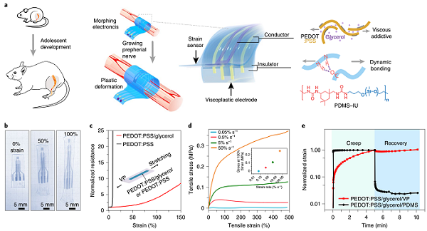 调节神经系统的生物电子学在治疗神经系统疾病方面已显示出前景。然而,它们固定的尺寸不能适应组织的快速生长,并可能损害发育。对于婴儿、儿童和青少年,一旦植入的设备长大后,往往需要额外的手术来更换设备,导致反复干预和并发症。在这里,斯坦福大学鲍哲楠教授、Paul M. George教授开发了能够在生长组织中实现神经调节的形变电子器械,适应体内神经组织生长与最小的机械约束。设计和制造多层变形电子元件,包括粘塑性电极和消除电子元件与生长组织之间界面应力的应变传感器。在植入手术过程中,变形电子器件能够自我修复,从而实现可重构和无缝的神经界面。在大鼠生长最快的时期,变形电子对大鼠的神经造成了最小的损伤,神经的直径增长了2.4倍,并允许慢性电刺激和监测2个月没有功能性行为中断。变形电子提供了一条通向生长适应儿童电子医学的道路。相关研究以“Morphing electronics enable neuromodulation in growing tissue”为题目,发表在Nature Biotech.上。