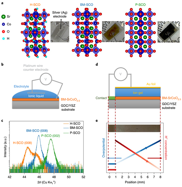 与广泛的电导率动态控制不同,不存在通过电势调节导热系数的类似能力。传统的观点认为,插入到材料晶格中的原子纯粹是热载体散射的来源,这只会降低热传导率。相比之下,这里麻省理工学院陈刚和Bilge Yildiz教授等人表明,电化学控制氧和质子浓度在氧化物提供了一种新的能力,双向控制热导。用电化学方法将SrCoO2.5氧化成钙钛矿SrCoO3-δ时,热导率增加2.5倍,而对其质子化以形成氢化SrCoO2.5则使热导率降低4倍。通过使用离子液体门控在单个设备中触发“三态”相变,可以实现室温下近10±4倍范围内的双向热导率调节。结合x射线吸收光谱的化学和结构信息、热反射热导率测量和从头计算,阐明了这些阴离子和阳离子物质以及晶格常数和晶格对称性的变化对热导率的影响。这种通过电手段控制多种离子类型、多种相变和跨越金属到氧化物绝缘行为的电子导电性的能力,为大范围调节热传输提供了一个新的框架。相关研究以“Bi-directional tuning of thermal transport in SrCoOx with electrochemically induced phase transitions”为题目,发表在Nature Mater.上。