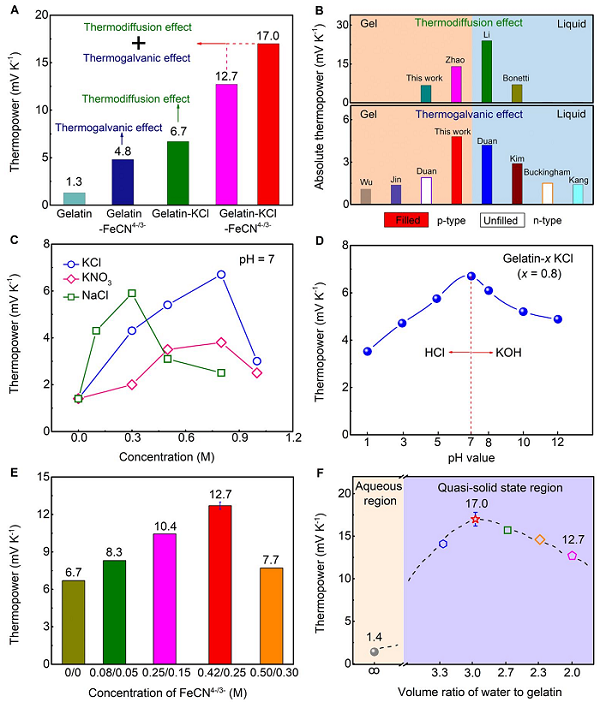 从环境中收集能量并转化为电能为物联网传感器提供电能的发展中有重要意义,通过这种供电作用能够使其免于电缆/电池供电,支持了可穿戴设备的发展。热电材料器件中,通过离子作为载流子,通常需要在不同温度中在两个电极之间进行热扩散或还原反应。南方HTH官网地址 大学刘玮书、麻省理工学院陈刚教授等发展了一种基于明胶(gelatin)的器件,通过碱金属盐和铁基还原对配合,产生了一个非常大的热电转化效果。并且该装置通过身体上发热就能够得到足够的能量。制成的器件中最高的热电能达到17.0 mV/K,明胶中的离子传输通过KCl,NaCl,KNO3进行热扩散作用,并通过[Fe(CN)64-/Fe(CN)63-]提升热电效应。当通过身体热能作为热源的可穿戴器件中就可以达到2 V的热电效应和最高5mW的功率。这种离子型明胶展现出离子能量载体在热电转换中的重要应用前景。相关研究以“Giant thermopower of ionic gelatin near room temperature”为题目,发表在Science上。