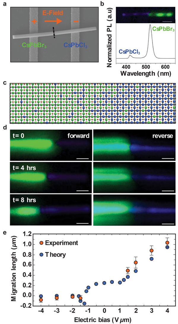 图8 CsPbBr3-CsPbCl3异质结构纳米线中电场诱导卤化物离子迁移的示意图和表征