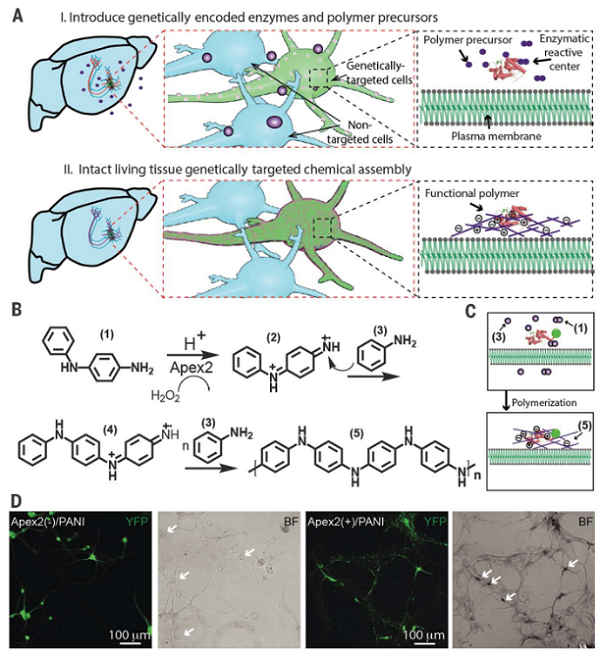 多细胞生物系统(如大脑)的结构和功能复杂性超出了人类的设计和组装能力。活体组织中的细胞可以被用来构建合成材料或结构,如果按照解剖学上的定义来处理特定化学,利用生物学来组装复杂的功能结构。通过整合工程酶靶向和聚合物化学,斯坦福大学鲍哲楠教授、Karl Deisseroth教授等人从基因上指示特定的活神经元来指导在质膜上的电功能(导电或绝缘)聚合物的化学合成。电生理和行为分析证实,合理设计、基因定向组装的功能聚合物不仅保留了神经活性,而且实现了膜性质的重塑,调节了自由移动动物的细胞类型特异性行为。这种方法可以在生命系统中创造出多样、复杂和有功能的结构和材料。相关研究以“Genetically targeted chemical assembly of functional materials in living cells, tissues, and animals”为题目,发表在Science上。