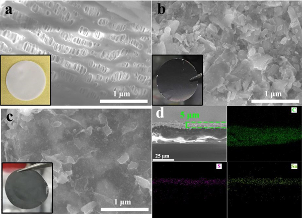 (a)-(c) 分别为初始PP隔膜、PP担载的SnS-G和PP担载的A-SnS-G的SEM图像和照片;