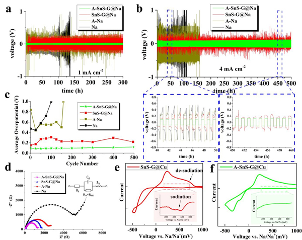 (a)和(b)基于A-SnS-G、Sn-G保护的钠金属负极和锂活化-钠(A-Na)、纯Na金属负极的对称电池在1 mA cm-2和4 mA cm-2电流密度条件下的电化学性能;