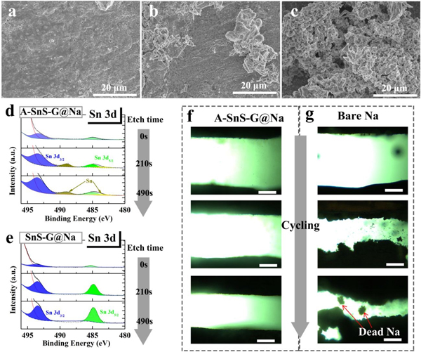 (f-g) A-SnS-G保护的Na金属(左)和纯Na金属(右)电镀-剥离的光学显微镜追踪(比例尺:600 μm)。