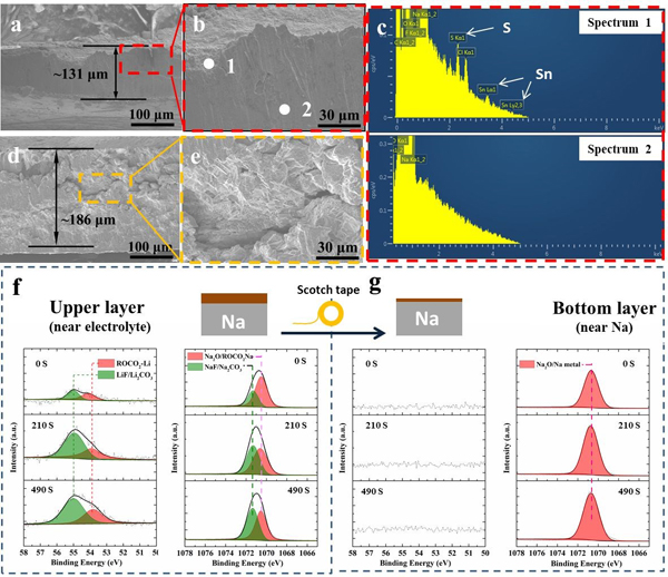EDS在循环后的Na金属电极表面探测到较多的Sn、S的化合物等,证实钠金属的沉积电解反应主要发生在A-SnS-G膜层的下方;经过300次反复循环后的表面上依然检测到了“锂活化”过程引入的Li-基SEI组分(ROCO2-Li、Li2CO3和LiF)处于处于电极表面近电解质一侧、而在循环过程中新形成的Na-基SEI组分处于电极表面近Na金属一侧,喻示着Li-基SEI在隔离电解液副反应、促进钠金属稳定循环的过程中可能起到了关键性的重要作用。