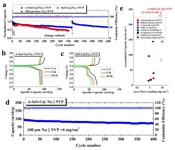 (a) 全金属钠电池(SMB)电池的稳压循环性能,薄A-SnS-G@Na、SnS-G@Na或Na负极与NVP正极配对;