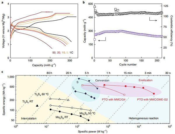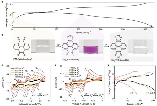 近日,美国休斯敦大学姚彦教授和丰田北美研究所(TRINA) Rana Mohtadi教授(共同通讯作者)提出了一种双管齐下的策略,解决了一直以来镁电池实际功率密度较低的难题!比目前最佳性能还高出两个数量级。一方面,通过绕开常规Mg阴极难以解决的高固态扩散势垒难题,通过异相烯醇化氧化还原化学(不发生键断裂/重新形成),来实现快速的正极氧化还原动力学;另一方面,通过在醚类混合溶剂中使用由弱配位阴离子组成的电解质,改善电解液的离子导电率和Mg2+的脱溶。具体来讲,通过利用有机正极材料Pyrene-4,5,9,10-四酮(PTO)与改性的MMC电解质溶液,在独特的醚混合物中而具有高溶解度的改性MMC电解质溶液相结合。结果表明,这两种材料都表现出了优异的性能。相对于Mg2+/Mg,在2.1 V电压下测试的PTO比容量为315 mAh g−1,还可以在20 mA cm-2的电流密度下进行无枝晶的Mg沉积/剥离。此外,基于这种策略,研究人员最终所制备的高功率镁电池,其具有高达20 A g−1的充放电功率,提供30.4 kW kg−1的超高比功率,远超于目前最先进的镁电池(0.45 kW kg−1)近两个数量级。相关研究成果以“High-power Mg batteries enabled by heterogeneous enolization redox chemistry and weakly coordinating electrolytes”为题发表在Nature Energy上。