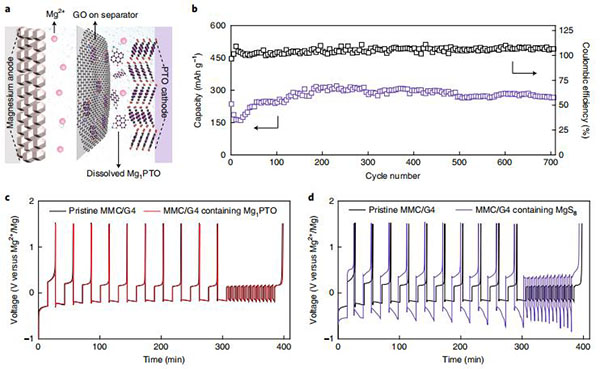 (a)薄(~2μm)和轻质(0.48 mg cm–2)GO膜的Mg-PTO电池原理图;