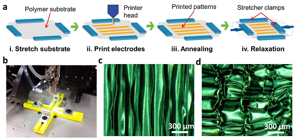 图1:4D打印可拉伸电极的制备过程。(a)利用复合材料油墨(RGO-CNT-PH1000)直接打印可拉伸电极的流程示意图。(b)4D打印过程的实验设计和配置。(c,d)4D打印的可拉伸电极的微米尺度的自组装折纸(褶皱)形貌。