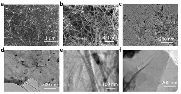 图2:打印的可拉伸电极的材料表征。(a)RGO-CNT-PH1000复合材料电极的扫描电镜图。(b)碳纳米管网状结构的扫描电镜图。(c)RGO-CNT复合材料的透射电镜图。(d,e,f)RGO-CNT-PH1000复合材料的透射电镜图。