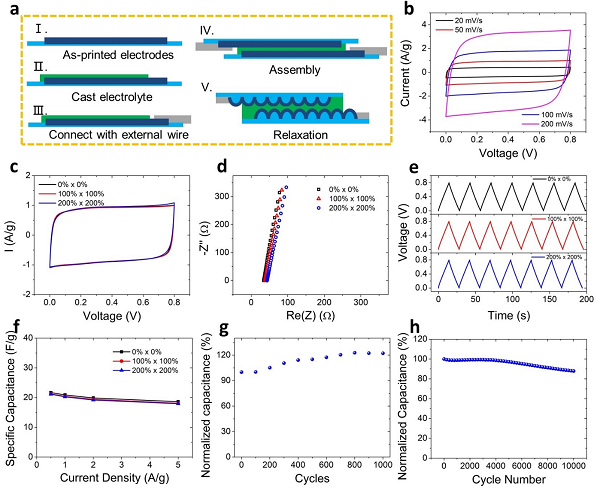 图3:4D打印的可拉伸超级电容器的电化学表征。(a)可拉伸超级电容器的装配流程示意图。(b)可拉伸超级电容器在100%×100% 双向拉伸应变下,不同扫描电流速率时的伏安曲线。(c)可拉伸超级电容器在不同应变状态下,50毫伏/秒时的伏安曲线。(d)可拉伸超级电容器在不同应变条件下的阻抗图。(e)可拉伸超级电容器在不同应变时的恒流充放电图。(f)可拉伸超级电容器在不同应变条件下的比电容变化图。(g)可拉伸超级电容器在1000次机械拉伸-释放循环中的归一化电容变化情况。(h)可拉伸超级电容器在10,000次恒流充放电循环中的归一化电容变化情况。