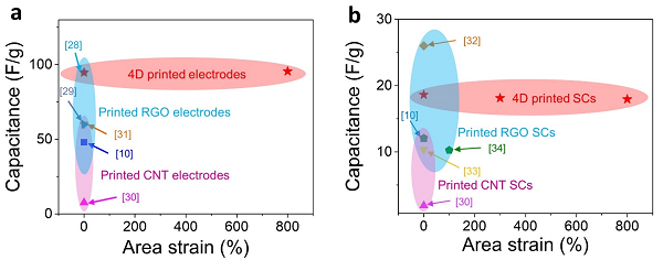 图4:4D打印的可拉伸超级电容器与其他方法制备的超级电容器的电化学性能和机械拉伸性能对比。(a)可拉伸电极。(b)可拉伸超级电容器。