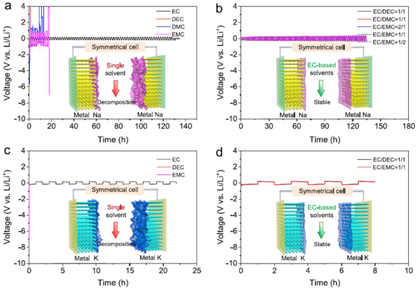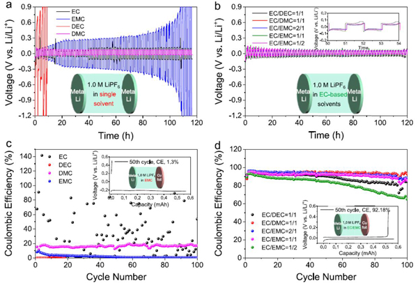 (a,b)当(a,c)单一溶剂(例如EC、DEC、DMC和EMC)时,Li|Li对称电池的典型电压-时间曲线和(c,d)使用Li|Cu半电池进行库伦效率比较测试。(b)中的插图显示了电压随时间变化的曲线。