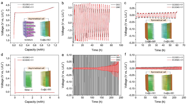 (e,f)在(e)DEC和EMC中以及在(f)EC/DEC和EC/EMC电解质的新电池(Cu@Li-SEI|Cu@Li-SEI)中,在1.0 M LiPF6中测试了典型的极化曲线。插图显示了相应的电池配置。