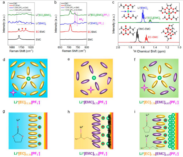 (c)EMC(-CH3)在不同电解质中的1H NMR。(c)的插图分别显示了EMC-EMC、EC-EMC、Li+[EMC]4和Li+[EC]3[EMC]可能的相互作用。蓝色箭头表示在第一个溶剂化壳中的另外两个配位的EMC分子。 EC、EMC和EC/EMC在1.0 M LiPF6电解质中(d-f)分子相互作用和(g-i)提出的界面模型的示意图。