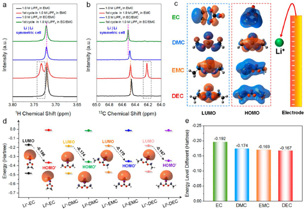 (c)Li+ -溶剂的电子从电极转移到最低未占据分子轨道(LUMO)的模型。