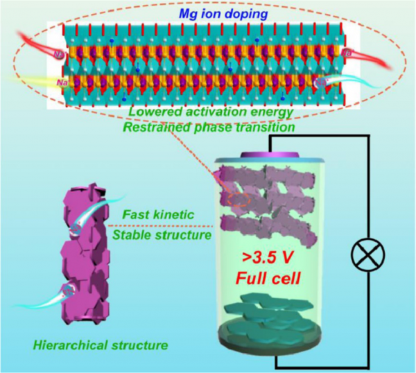 P2型Na0.67Ni0.33Mn0.67O2是一种典型的层状过渡金属氧化物,由于其具有高能量密度的优点,已被广泛研究作为未来实用的钠离子电池负极材料。然而,它的差循环性和低倍率性能严重阻碍了它的实际应用。近日,中国科学技术大学章根强等人报道了一种稳定的P2-Na0.67Ni0.33Mn0.67O2层状正极,该正极同时实现了镁掺杂和由纳米板亚基组装而成的层状一维纳米结构。原位X射线衍射和扩散动力学分析表明,Mg离子掺杂抑制了P2-O2相变并降低了界面电荷转移的活化能。此外,与块纳米结构相比,多层纳米结构具有坚固的结构,在150次循环内,其容量保持率从74.8%提高到92.2%。由于综合优势,这种独特的材料表现出优异的电化学性能,半电池在5C下循环1000次后具有90.9%的高容量保持率。更重要的是,与之前报道的基于层状氧化物正极的最新技术相比,该研究中的全电池可实现最高的平均工作电压3.56 V和出色的能量密度249.9 Wh kg−1。这为开发具有实用性的高能量钠离子电池提供了新的契机。