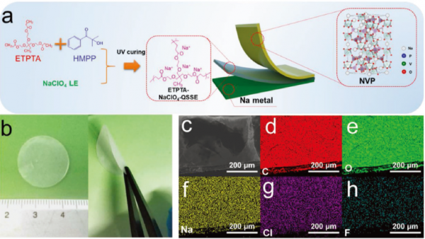 固态钠金属电池(SMBs)由于钠的丰富性和经济性,是一种极具发展前景的可充电池。然而,固态电解质的室温离子电导率低、电压窗窄,严重制约了SMBs的发展。近日,中科院大连化学物理研究所吴忠帅等人通过光聚合为高能密度固态SMBs开发了一种基于三羟甲基丙烷三丙烯酸酯的准固态电解质(ETPTA–NaClO4–QSSE)。ETPTA–NaClO4–QSSE具有显著的室温离子电导率1.2 mS cm−1、大于4.7 V vs. Na+/Na的宽电化学窗口以及出色的柔性。由于这种电解质和电极之间具有良好的界面相容性,Na金属对称电池在0.1 mA cm−2下表现出1000 h的超长循环,在1 mA cm−2下表现出355 mV的超低过电势,这表明Na枝晶的生长被显著抑制。值得注意的是,Na3V2(PO4)3||ETPTA–NaClO4–QSSE||Na全电池显示出空前的倍率性能,在15C下的比容量为55 mAh g−1高于迄今为止所有报道的固态SMBs,并且在5C下具有优异的长期循环稳定性,循环1000次后容量保持97%。此外,Na3V2(PO4)3||ETPTA–NaClO4–QSSE||Na软包电池具有出色的柔性和安全性。因此,这项工作将为开发室温高能密度固态SMBs提供新的机遇。