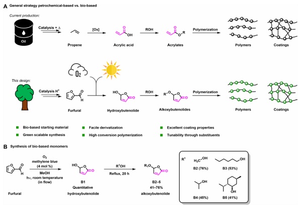 涂料在日常生活中无处不在,在建筑中必不可少,可用于提高从罐到汽车的众多产品的性能和耐用性。涂料中的聚合物和树脂是使用石油化工原料生产的。但是,在不损害最终产品的功能和性能的前提下,环保意识以及基于对可再生资源和无废料,低能耗化学转化的可持续材料需求来设计未来绿色化学的需求。在当今通常使用的多步骤工艺中,中链到长链的化石基烃通过裂化转化为烯烃,进一步氧化并衍生为丙烯酸酯,随后聚合生成各种塑料,树脂和涂料。全球丙烯酸酯的年产量超过350万吨,很明显,可持续的替代品保持丙烯酸酯类材料的良好性能,可以在明天的化学和材料方面带来巨大变革。尽管在将可再生原料用于燃料,聚合物和特种化学品方面取得了进展,并且以设计良性和低废物转化为目的的光氧化还原和电化学转化方面的最新进展,丙烯酸酯基涂料的直接生物质替代品仍然很大未开发。尽管现在已经很好地建立了基于生物的聚酯,但是关于丙烯酸酯类似物的(共)聚合的有限报道并未揭示材料的功能或与普通丙烯酸酯相比,表明反应性存在较大差异。