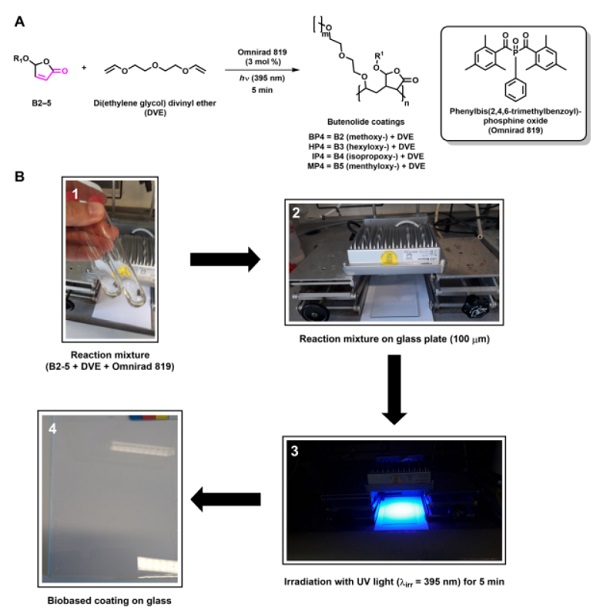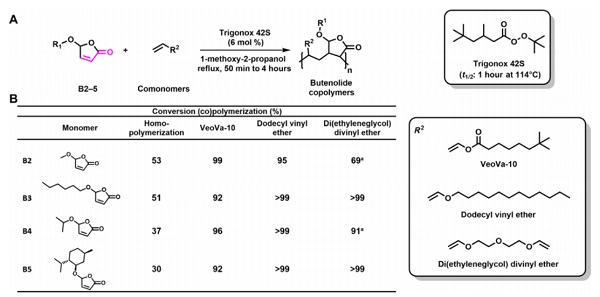 (B)生物质衍生的糠醛的光氧化,然后衍生为包含丙烯酸酯型结构的烷氧基丁烯内酯单体