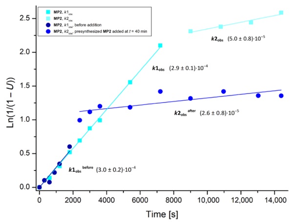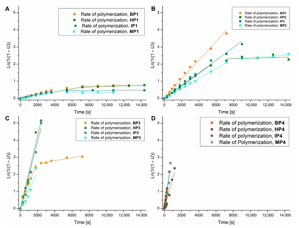 (A)甲氧基丁烯内酯(BP1),己氧基丁烯内酯(HP1),异丙氧基丁烯内酯(IP1)和薄荷基氧基丁烯内酯(MP1)的均聚速率 (B)VeoVa-10与甲氧基丁烯内酯(BP2),己氧基丁烯内酯(HP2),异丙氧基丁烯内酯(IP2)和薄荷基丁烯内酯(MP2)的共聚速率