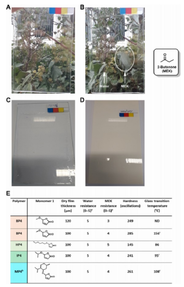 (C)玻璃上的透明,均匀且坚硬的己氧基丁烯内酯涂层HP4 (D)在聚丙烯上的透明,均匀且坚硬的己氧基丁烯内酯涂料HP4 (E)各种烷氧基丁烯化物涂层的性能摘要