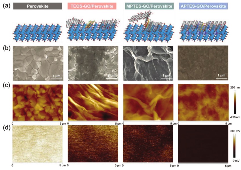 a)钙钛矿表面的TEOS-氧化石墨烯、MPTES-氧化石墨烯和APTES-氧化石墨烯层示意图;