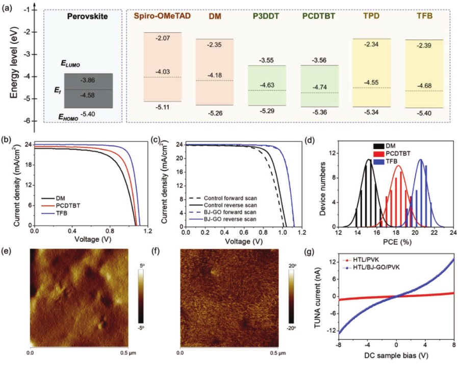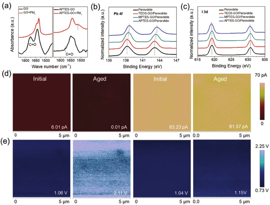 d, e) 在具有FTO/ETL/钙钛矿/HTL或FTO/ETL/钙钛矿/BJ-GO/HTL结构的器件中去除电极,得到初始HTL薄膜和老化HTL薄膜的平面导电性图和平面电位图。