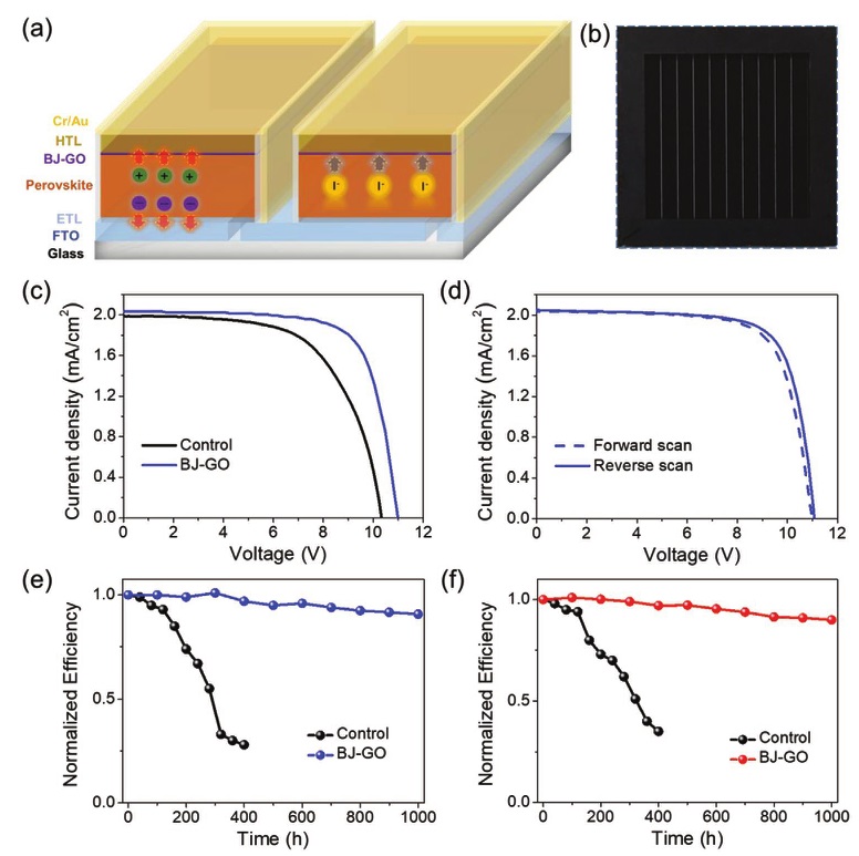 近日,上海交通大学韩礼元教授团队的毕恩兵博士、陈汉副教授(共同通讯作者)等人在Adv. Energy Mater.上发表了一篇题为“A Scalable Integrated Dopant-Free Heterostructure to Stabilize Perovskite Solar Cell Modules”的文章。报道了一种可扩展的异质结构,该异质结构由富碘表面的无甲铵钙钛矿膜、桥接氧化石墨烯纳米片(BJ-GO)的超薄夹层和不含掺杂剂的HTL构成。在这种异质结构中,碘离子被致密的2D网络物理固定,铅缺陷被配位键化学钝化。此外,具有可调表面能的BJ-GO将高度有序的HTL的载流子迁移率提高一个数量级。最后,采用该异质结构的面积为35.80 cm2的PSC模块显示出15.3%的认证效率。封装的PSC模块在85°C和85%相对湿度下湿热测试1000小时后,保有初始效率的91%以上;在60°C的持续1个标准太阳光照下,在最大功率点下保持初始值的90%以上达1000小时。