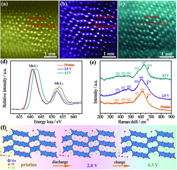 (a-c)不同充放电状态下LixMnO2电极的HAADF-STEM图像;