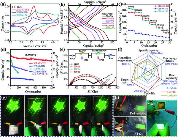 (f)基于3D LixMnO2、LiMn2O4和LiCoO2正极的TFBs对比;