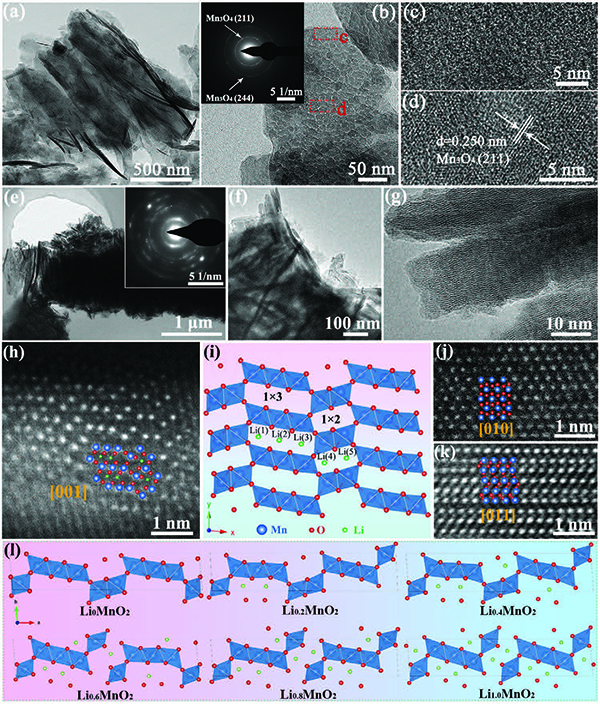(j,k)3D LixMnO2在[010]和[011]方向的HAADF-STEM图像;