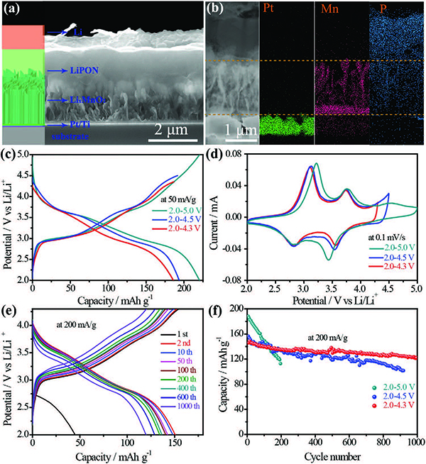 近日,南京理工大学夏晖教授、中国科学院物理研究所谷林研究员(共同通讯作者)等人提出了采用简易的电解质Li+离子注入策略,在180℃的极低温度下制备具有隧道结构的LixMnO2纳米片阵列作为TFBs的3D正极。研究表明,LixMnO2正极具有独特的隧道共生结构,其由1×3和1×2隧道交替组成,在2.0~4.3 V电压范围内表现出高的比容量和良好的结构稳定性。通过利用3D LixMnO2正极,成功构建了全固态LixMnO2/LiPON/Li TFB(3DLMO-TFB),其显著优点是极大地丰富了正极/电解液界面,缩短了Li+在3D结构中的扩散长度。此外,3DLMO-TFB器件具有较高的比容量(在50 mA g-1时为185mAh g-1)、良好的倍率性能和出色的循环性能(1000次循环后容量保持率为81.3%),优于基于在高温下制备的尖晶石型LiMn2O4薄膜正极的TFBs。重要的是,这种低温制备高性能正极薄膜的方法可以使TFBs在各种刚性和柔性衬底上制备,从而有望极大地拓展TFBs在微电子领域的潜在应用。相关研究成果以“Tunnel Intergrowth LixMnO2 Nanosheet Arrays as 3D Cathode for High-Performance All-Solid-State Thin Film Lithium Microbatteries”为题发表在Adv. Mater.上。