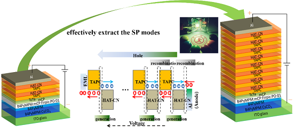 照明用电超过了全球电力总消耗的20%以上,已经广泛应用于平板显示产品的有机电致发光二极管(OLEDs)技术具有色温可调节、轻薄面光源、柔性、低深蓝光成分的特点,可以和无机LEDs优势互补,在固态照明领域具有广泛的应用前景。相比于白光LEDs,白光有机电致发光二极管(WOLEDs)的功率效率仍然偏低,一定程度上限制了WOLEDs的固态照明应用。在WOLEDs中,要获得极限的功率效率,需要同时实现接近100%的内量子效率、尽可能低的器件驱动电压和尽可能高的器件光提取效率。实际上,利用有机磷光和延迟荧光材料可以实现接近100%的内量子效率;采用激基复合物主体以及电掺杂技术也可实现低的器件驱动电压。然而,WOLEDs中金属电极引起的等离子体模式能量损失极大阻碍了光提取效率的提高,基于布拉格衍射机制的褶皱结构器件在有限降低等离子体模式能量损失的同时会破坏器件的平面型以及产生额外的漏电流,从而限制了WOLEDs效率的进一步突破。