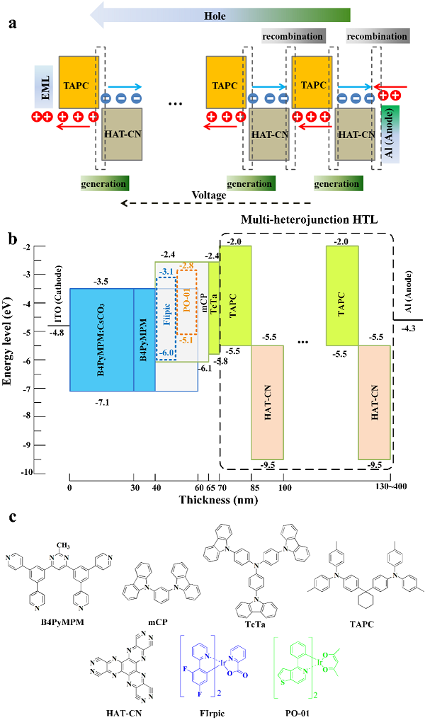 图一. (a) 超厚有机多异质结空穴传输层原理图,(b)反型WOLEDs的器件结构和能级,(c)器件所用材料的分子结构。