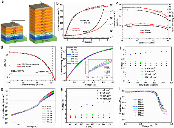 图三. 普通玻璃基板(折射率1.45)制备的反型WOLEDs (a) 60 nm和240 nm厚度有机多异质结空穴传输层WOLEDs器件结构示意图,(b) 60 nm和240 nm厚度有机多异质结空穴传输层WOLEDs器件的 J-L-V曲线对比,(c) 60 nm和240 nm厚度有机多异质结空穴传输层WOLEDs器件EQE和PE曲线对比,(d) 240 nm厚度有机多异质结空穴传输层WOLED器件EQE曲线和TTA模型拟合,(e) I-V曲线细节,(f) 不同有机多异质结空穴传输层厚度器件在1, 5, 10, 和100 mA cm-2电流密度下的电压曲线,(g)不同厚度(周期)有机多异质结堆叠器件的I-V曲线,(h)不同厚度(周期)有机多异质结堆叠器件在1, 5, 10, 和100 mA cm-2电流密度下的电压曲线,(i) 不同厚度(周期)有机多异质结堆叠器件的C-V曲线。