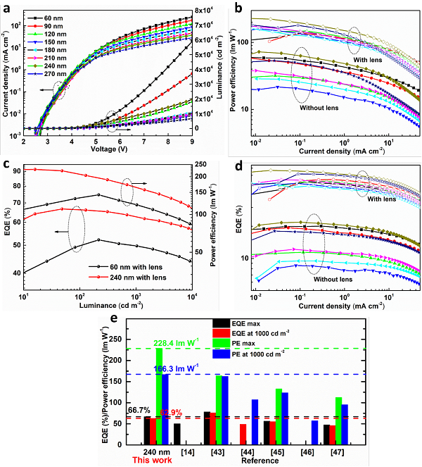 图四. 高折射率玻璃基板(折射率1.75)制备的反型WOLEDs (a)J-L-V曲线,(b) PE曲线,(c) 60 nm和240 nm厚度有机多异质结空穴传输层WOLEDs器件EQE和PE曲线对比,(d) EQE曲线,(e) 和文献报道的器件性能对比。