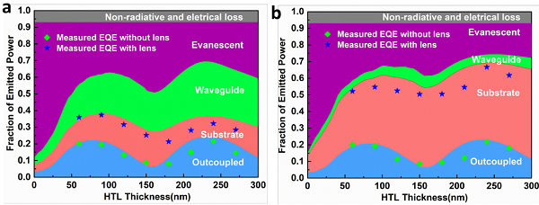 图五. 理论仿真和峰值效率实验结果对比 (a)普通玻璃基板(折射率1.45)WOLEDs器件,(b)高折射率玻璃基板(折射率1.75)WOLEDs器件。