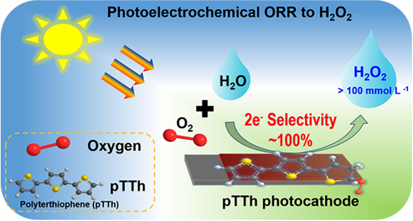 大连化物所李灿院士团队报道了聚苯乙烯(pTTh,一种无金属的窄带隙聚合物半导体,)作为高效的光电阴极,在碱性溶液中光电催化产生H2O2。ORR的2e-选择性取决于电解质的pH值,并且在pH〜13时接近100%。H2O2的浓度达到了创纪录的110 mmol L-1,比之前的光合成H2O2高两个数量级。此外,光电化学装置中的NiFeOx/BiVO4–pTTh双光电极可合成浓度约为90 mmol L-1的H2O2,数个循环内而不会出现任何明显的衰减。这种极高的2e–选择性归因于pTTh的固有电化学性质。理论计算表明,2e–过程中选择性决速步骤比4e–路径快200倍以上。该工作为产生液态太阳能燃料的替代方法铺平了道路,这在实际应用中非常有前途。