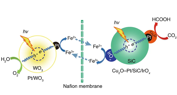 大连化物所李灿院士团队通过控制光沉积构建了Cu2O-Pt/SiC/IrOx复合材料然后以Nafion膜将还原和氧化半反应分隔开。该人造系统在可见光照射下具有出色的光催化性能,可将CO2还原为HCOOH,并将H2O氧化为O2。HCOOH和O2的产率几乎达到化学计量比,分别高达896.7和440.7 μmol·g-1h-1。人造系统中CO2还原和H2O氧化的高效率归因于Cu2O-Pt/SiC/IrOx的直接Z型电子结构以及间接Z型分离的还原和氧化单元,从而大大延长了光生电子和空穴的寿命,并防止了产物的后反应。这项工作为提高人工光合作用的效率提供了有效可行的策略。