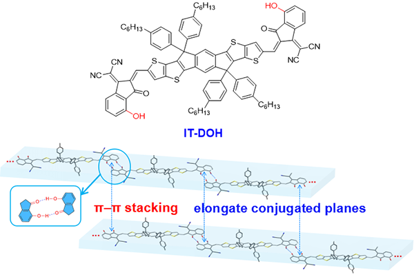 各种取代基已掺入非富勒烯受体(NFA)中,以调节吸收范围和能级,从而提高有机太阳能电池(OSC)的效率。通过这些取代操作来控制NFA的分子顺序和结晶度对于OSC性能同样至关重要,但这仍然具有挑战性。然而,羟基能够形成强分子间氢键(H键)促进分子重排,目前还未受到重视。鉴于此,大连化物所李灿院士团队合成了具有两个羟基官能化的非富勒烯受体(NFA),以调节分子堆积和结晶度。与母体ITIC相比,IT-OH和IT-DOH观察到有序的分子排列和更高的结晶度。这被认为是由羟基诱导的分子间氢键所形成的,它延长了分子共轭平面,通过π-π堆积导致了长程有序结构。通过适当的结晶度和与供体聚合物的混溶性,基于IT-DOH的非退火OSC可以提供12.5%的效率以及良好的器件稳定性。这项工作为通过引入羟基来调节分子堆积和结晶度以设计NFA提供了一种有前途的策略。