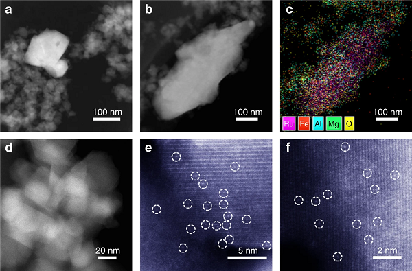 单原子催化剂(SAC)在许多异相反应中均表现出优异的催化性能。然而,以简单且大规模的制备热稳定的SAC仍然是一个巨大的挑战。鉴于此,张涛院士团队等人报道了通过将亚微米RuO2聚集体与MgAl1.2Fe0.8O4尖晶石进行物理混合,从商业RuO2粉末合成Ru SAC。通过球差校正扫描透射电子显微镜和X射线吸收光谱确认了原子分散的Ru。详细的研究表明,分散过程不是由气体原子的捕获机制引起的,而是由强共价金属-载体相互作用促进的反奥斯特瓦尔德熟化。这种合成策略简单易行,适合大规模生产用于工业应用的热稳定SAC。